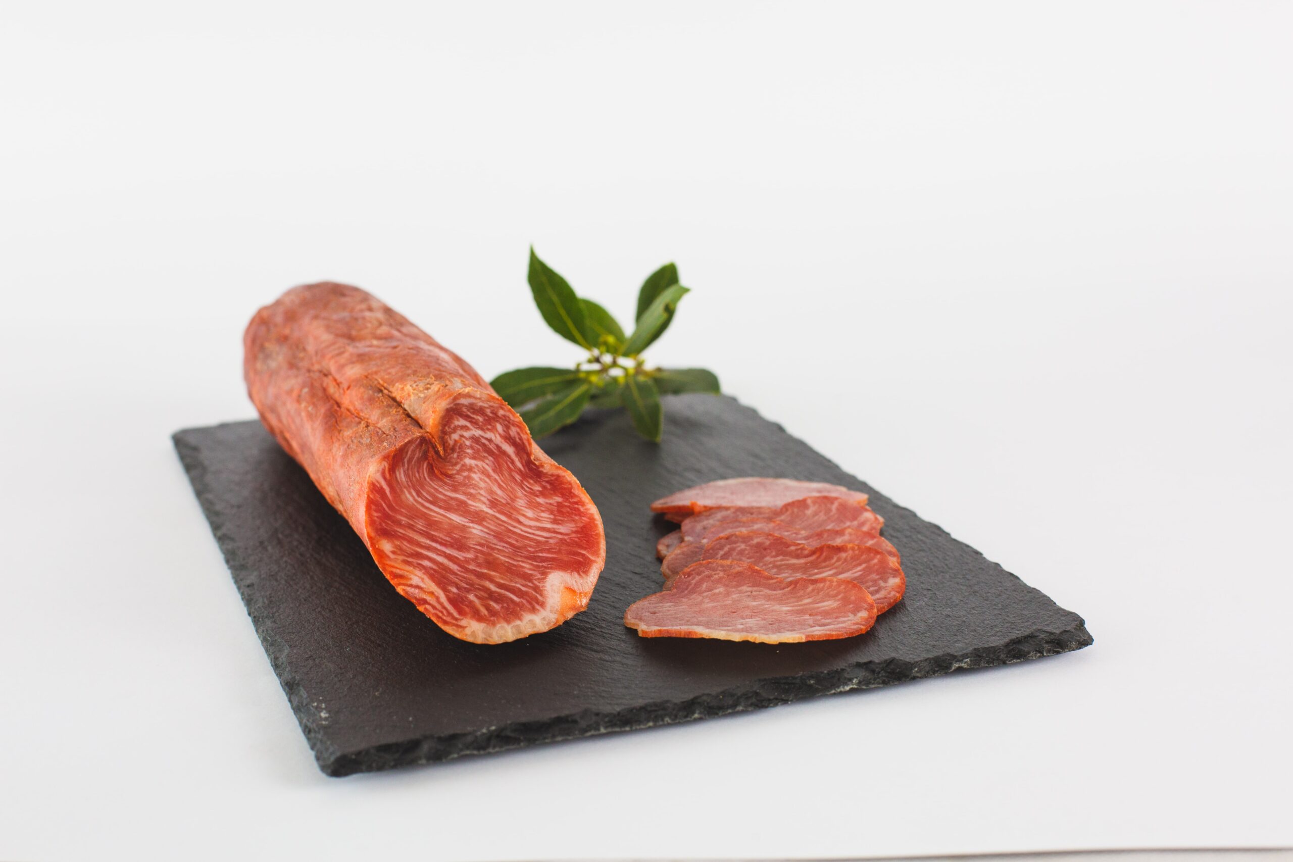 INGREDIENTES: Lomo de cerdo duroc (duroc 50%), sal, azúcar, especias, antioxidante (E-301), conservadores (E-252, E-250), corrector de la acidez E-331 (iii), pimentón, ajo, orégano..