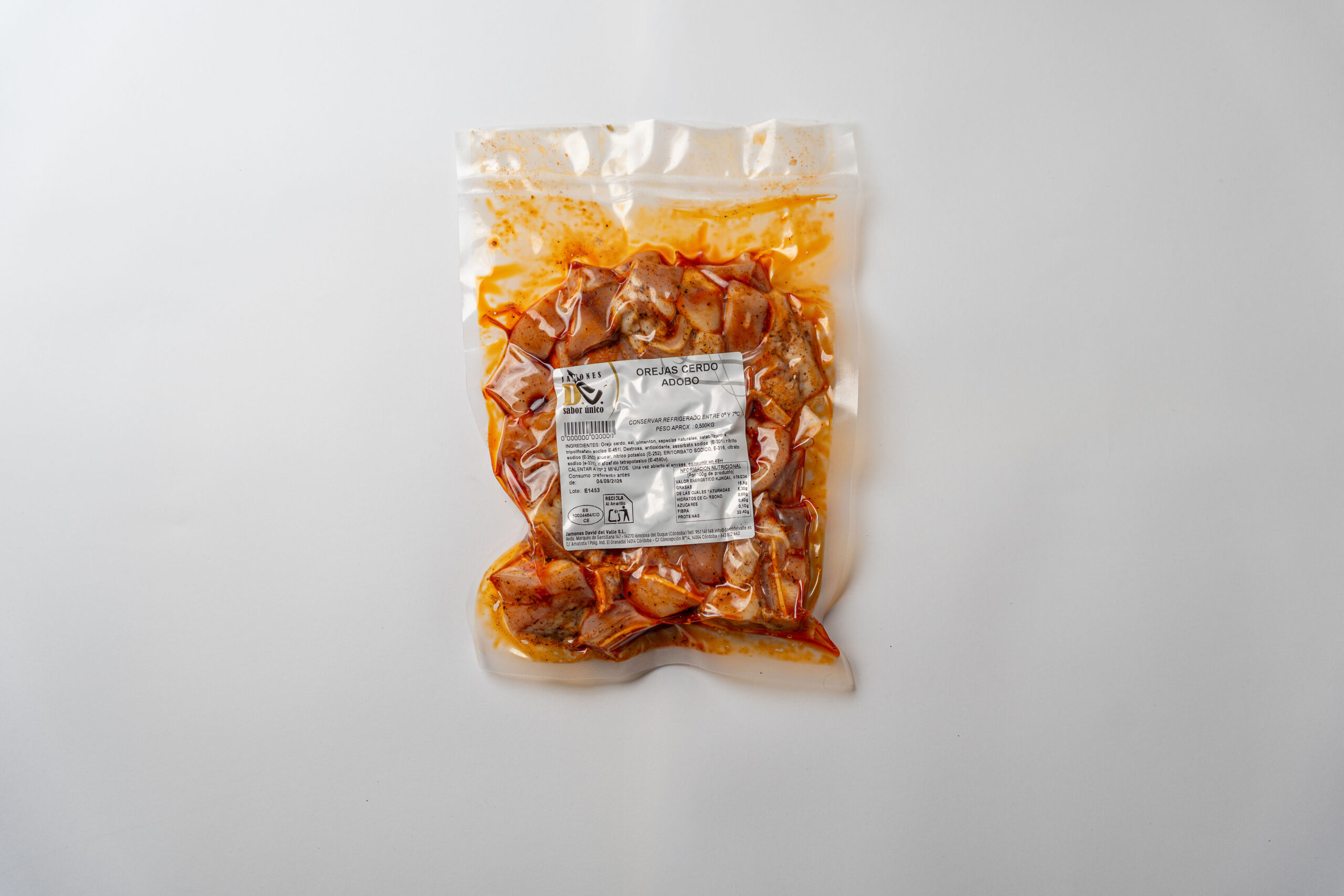 INGREDIENTES: Oreja cerdo, sal, pimentón, especias naturales, estabilizantes, tripolifosfato sodico E-451i, Dextrosa, antioxidante, ascorbato sodico (E-301) nitrito sodico (E-250) azucar, nitrico potasico (E-252), ERITORBATO SODICO, E-316, citrato sodico (e-331), disfosfato tetrapotasico (E-4560v).