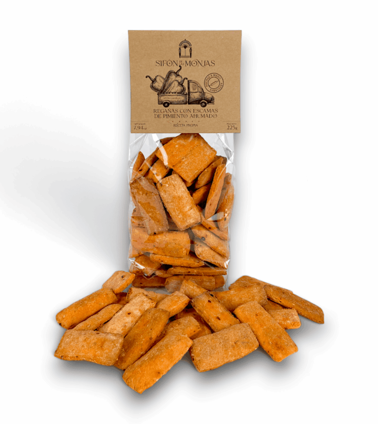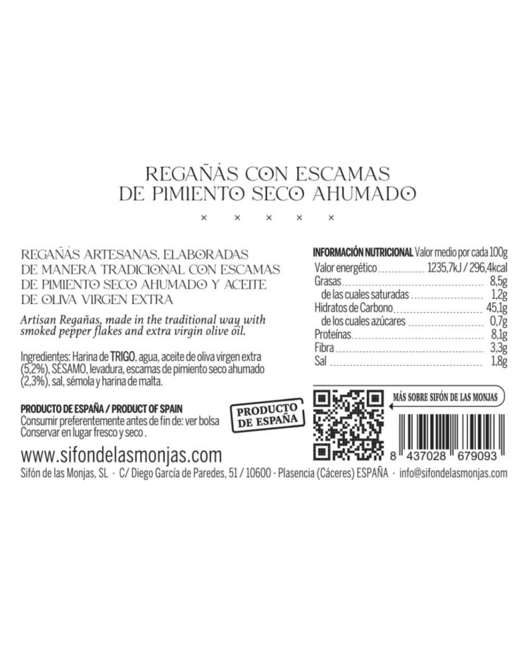 Elaboradas con harina de trigo, sésamo, aceite de oliva virgen extra y nuestras escamas de pimiento ahumado seleccionadas.